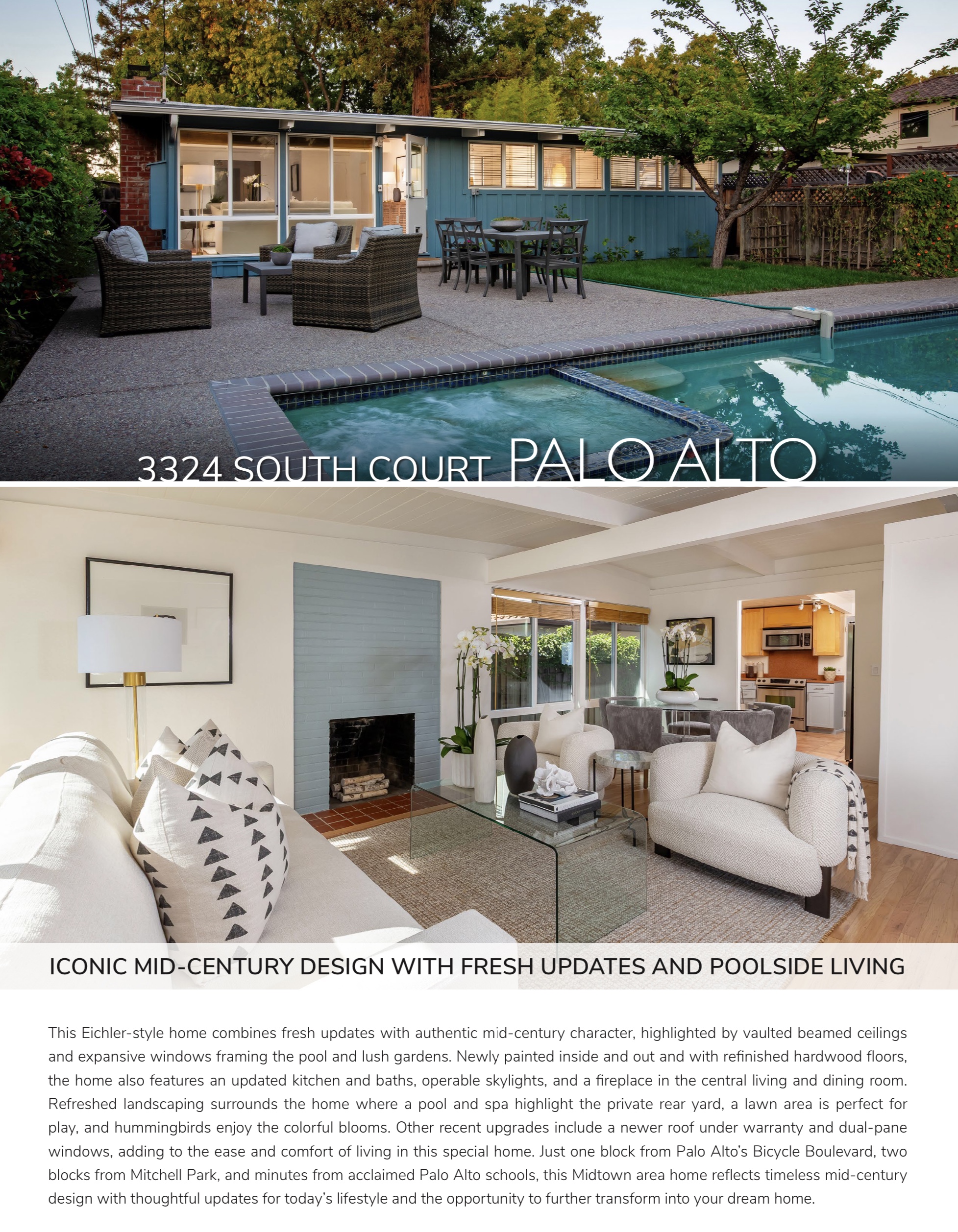 This Eichler-style home combines fresh updates with authentic mid-century character, highlighted by vaulted beamed ceilings and expansive windows framing the pool and lush gardens. Newly painted inside and out and with refinished hardwood floors, the home also features an updated kitchen and baths, operable skylights, and a fireplace in the central living and dining room. Refreshed landscaping surrounds the home where a pool and spa highlight the private rear yard, a lawn area is perfect for play, and hummingbirds enjoy the colorful blooms. Other recent upgrades include a newer roof and dual-pane windows, adding to the ease and comfort of living in this special home. Just one block from Palo Alto’s Bicycle Boulevard, two blocks from Mitchell Park, and minutes from acclaimed Palo Alto schools, this Midtown area home reflects timeless mid-century design with thoughtful updates for today’s lifestyle and the opportunity to further transform into your dream home.